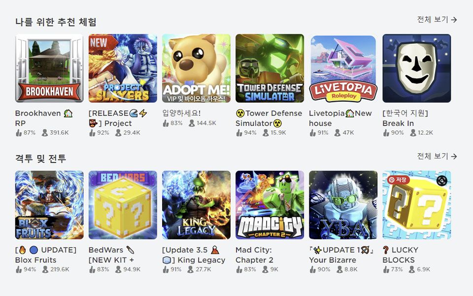 로블록스 바이브 의 체험(게임)들은 어느 메타버스 플랫폼과도 비교할 수 없을 만큼 다양합니다. 슈팅, 격투, 타이쿤, 서바이벌, 액션까지. 별별 체험이 다 있어서 인기 체험을 하나씩 해보는 것도 추천합니다. 조금은 의문이 들 수도 있습니다. 다양하긴 해도 그래픽과 기능이 좋은 유료 게임이 많은데 굳이 왜 로블록스 게임을 할까? 그건 바로 로블록스가 단지 게임이 아닌 일종의 ‘예능’이기 때문입니다. ‘런닝맨’ 같은 예능을 떠올려 보세요. 공포 콘셉트든, 물놀이 콘셉트든 상황은 바뀌지만 핵심은 출연진이 함께 노는 것이었죠. 로블록스도 마찬가지입니다. 그렇기에 최고의 그래픽이나 게임성은 필요 없습니다. 놀기 좋은 세트가 꾸며져 있으면 됩니다. 꼭 필요한 건 함께 놀 친구들이죠.