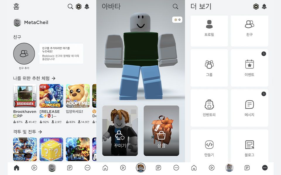 로블록스 바이브 는 메인 화면이랄 것이 없습니다. 처음 앱을 내려받아 가입하면, 아바타 꾸미기, 친구 추가, 체험(=게임) 딱 3가지만 첫 화면에 나타납니다. 아바타 꾸미기는 다른 메타버스 플랫폼과 크게 다르지 않습니다. 얼굴, 체형, 옷 등 원하는 대로 꾸밀 수 있는데요. 네이버의 메타버스 플랫폼인 제페토에 비교하면 좀 더 투박합니다. 캐릭터는 흔히 말하듯 레고 같죠. 인터페이스도 단순합니다. 제페토와 다른 점은 체험(게임) 만들기 기능을 좀 더 강조한 것과, 스마트폰이 아닌 PC에서도 플레이할 수 있다는 점입니다. 혹시 로블록스를 직접 해보려는 어른 세대 분들은 PC로 조작하시면 훨씬 편합니다.